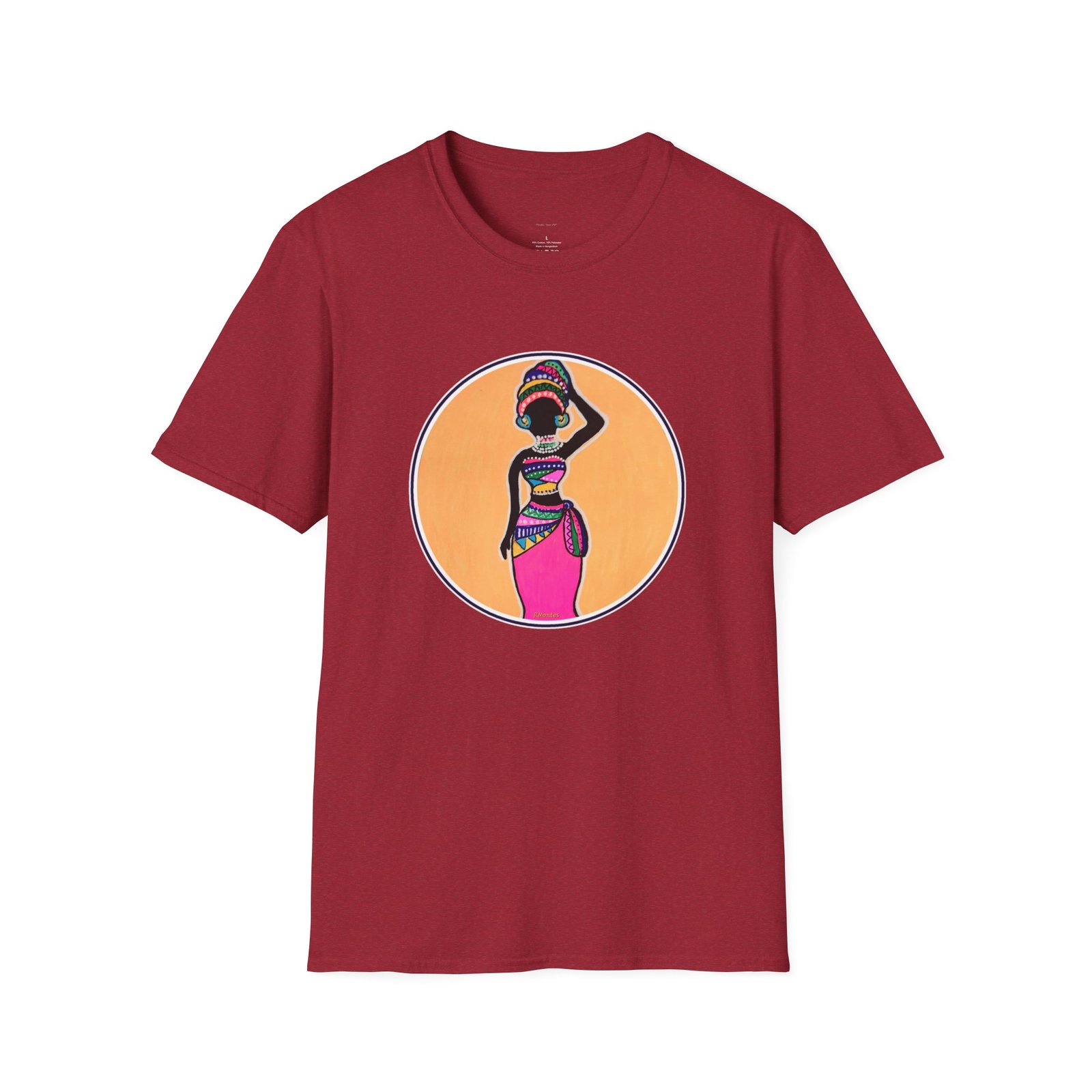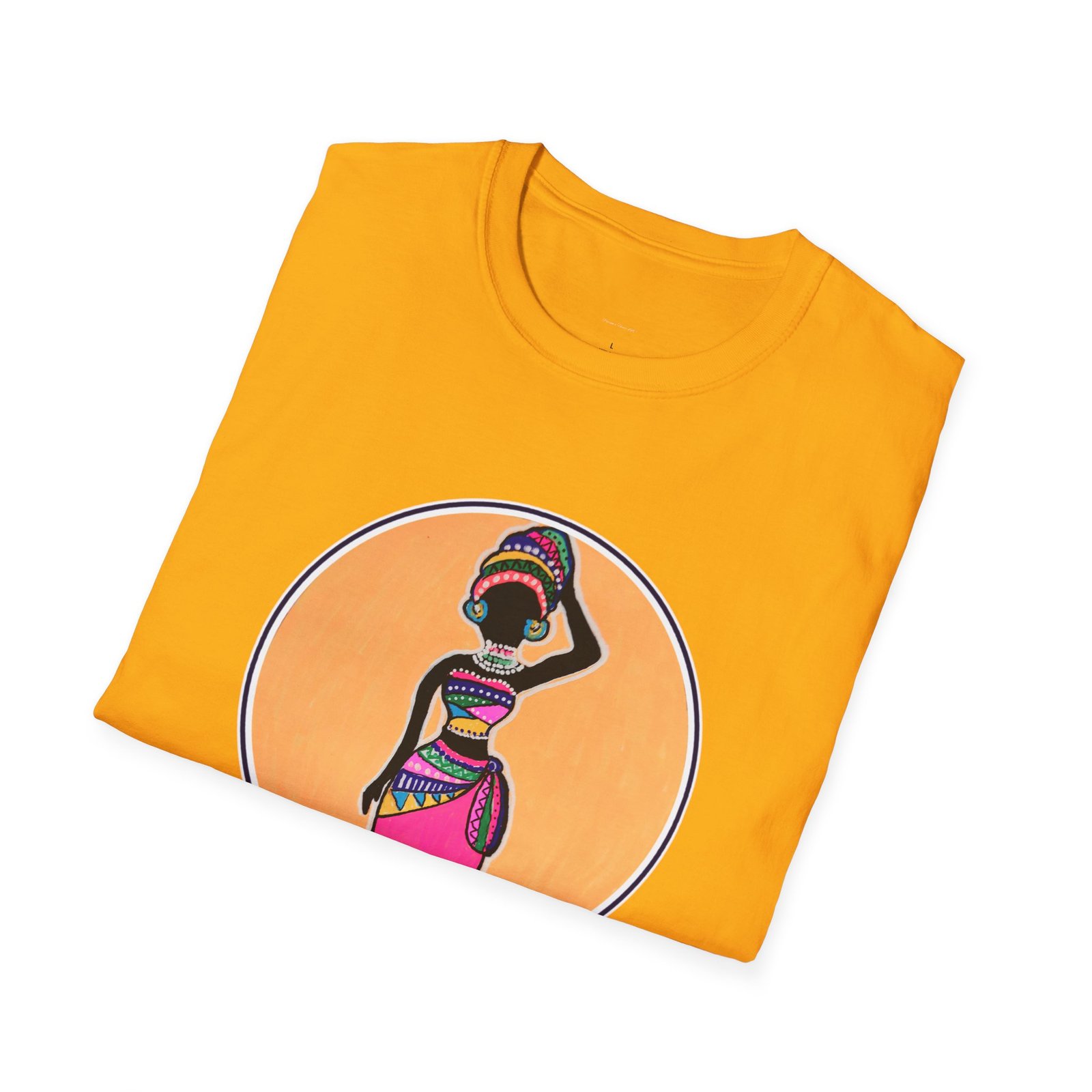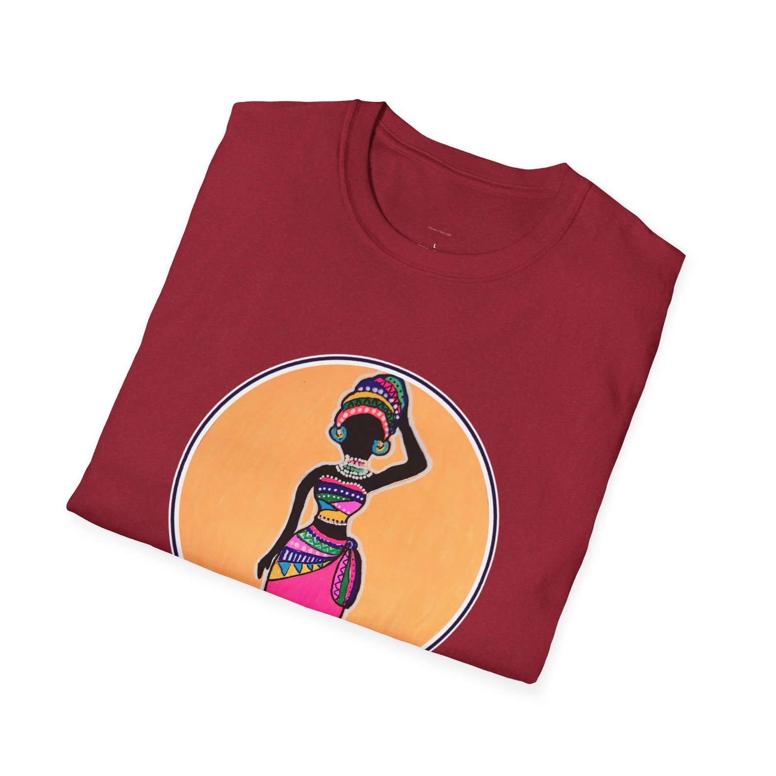 Caribbean folk art design printed on a soft and durable t-shirt titled the Resilient Woman, giving off a vibrant and empowering vibe. Perfect for Caribbean women who appreciate art and culture, this t-shirt is versatile and stylish for any occasion.