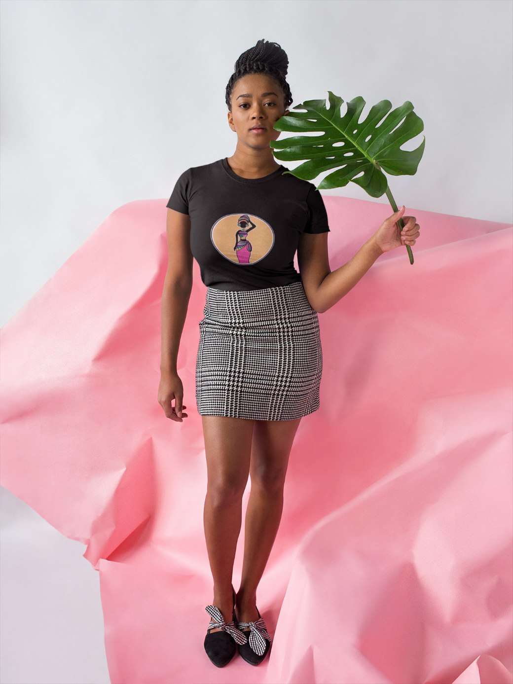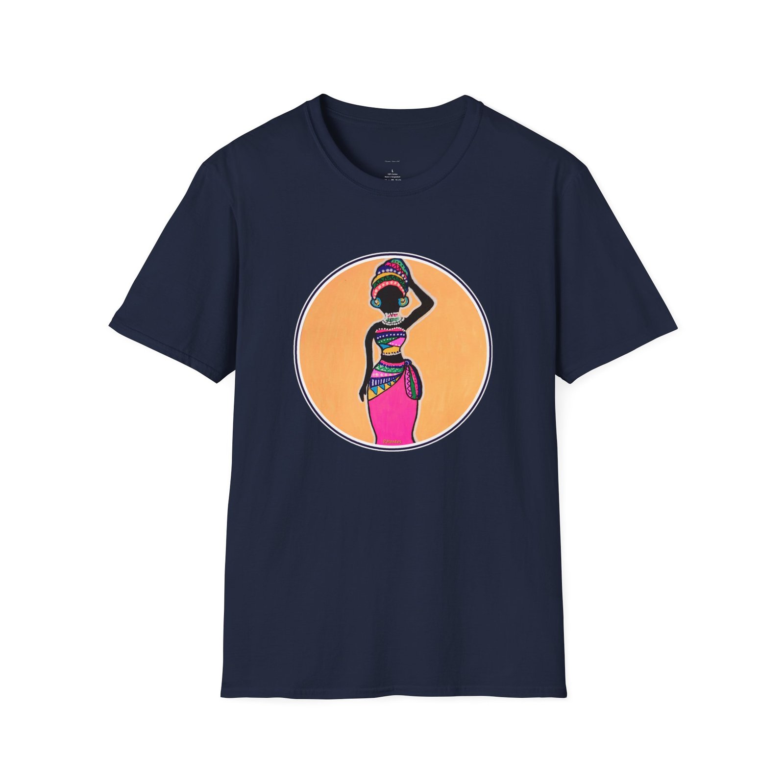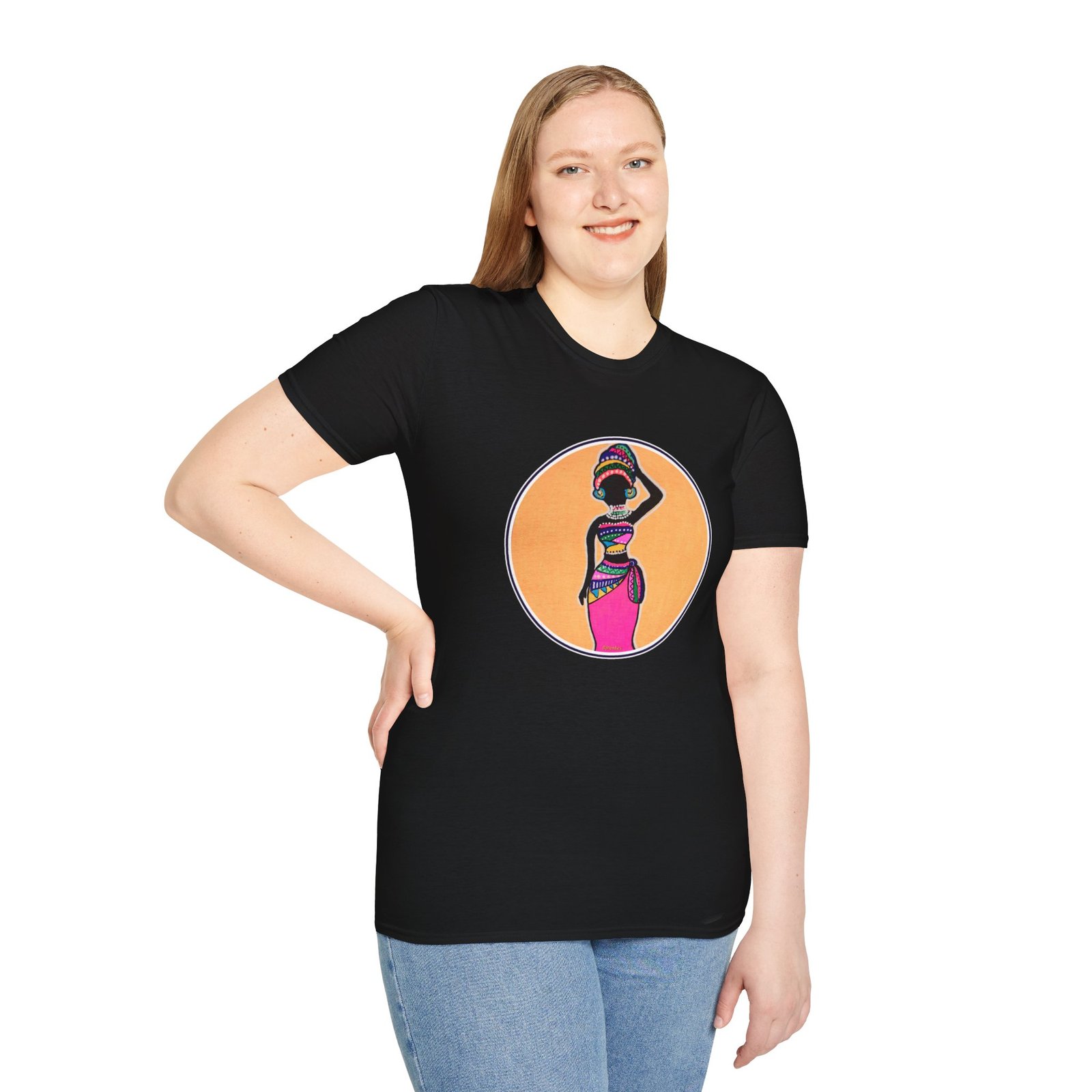 Caribbean folk art design printed on a soft and durable t-shirt titled the Resilient Woman, giving off a vibrant and empowering vibe. Perfect for Caribbean women who appreciate art and culture, this t-shirt is versatile and stylish for any occasion.